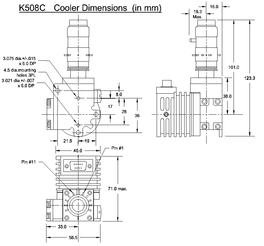 K549 Split Stirling Cryocooler: This cooler combines the famous reliability and rigidity of our microcooler family with the split configuration for compactness and better control of heat rejection and vibrations. Cold finger/dewar assembly identical and interchangeable with model K508. Built-in electronic module contains closed loop temperature controller and various options for motor stator configuration motor voltage and accessories.